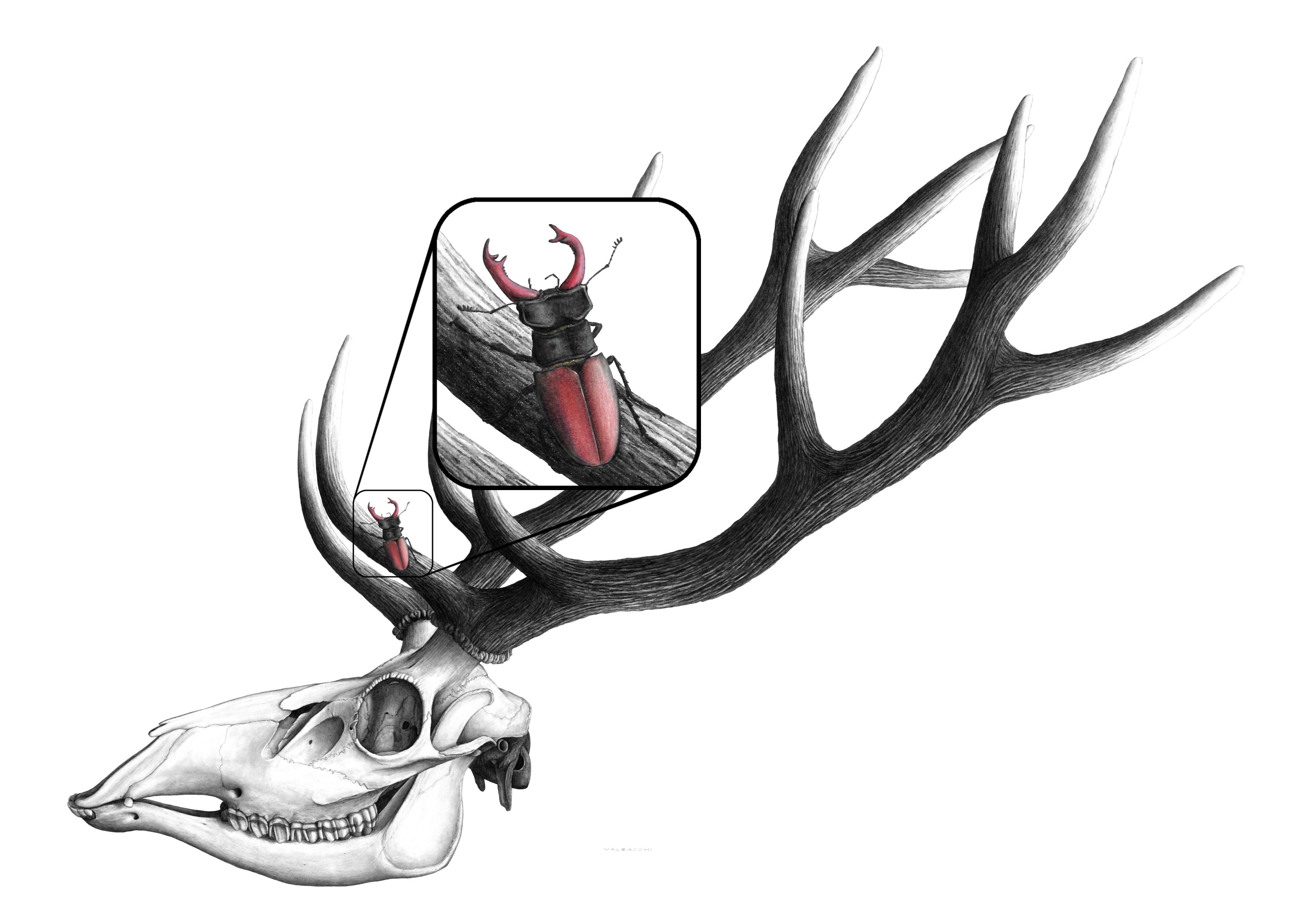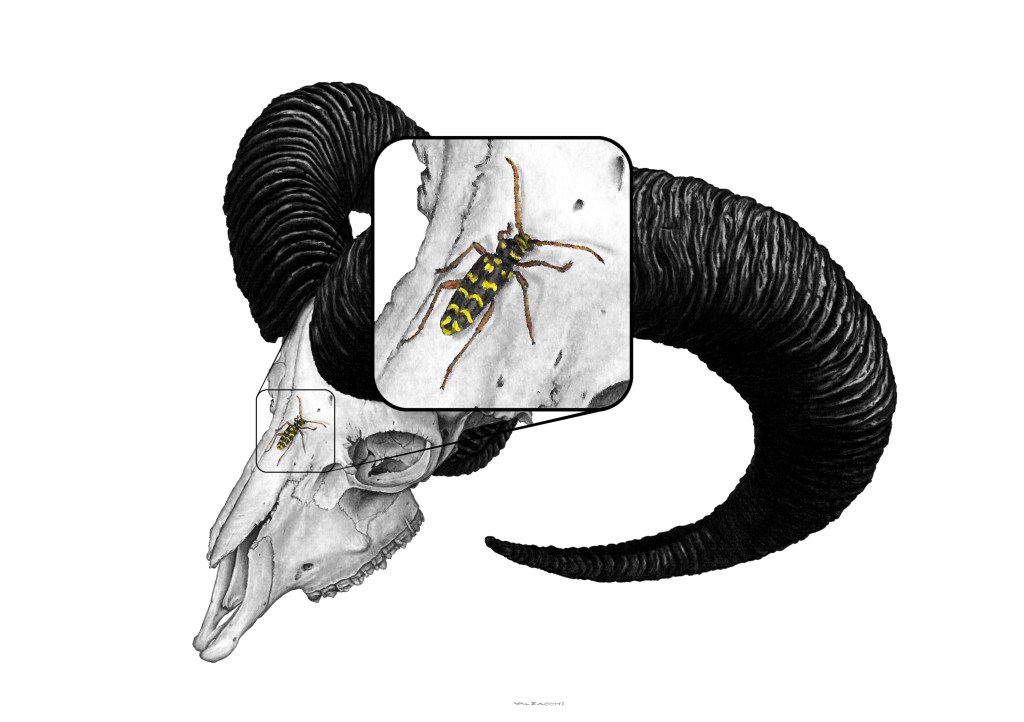 Giraffe (Giraffa camelopardalis) und Giraffenhalskäfer (Trachelophorus giraffa)